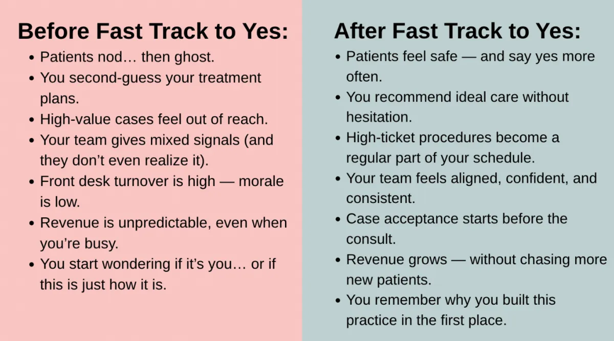 You’ll get access to 5 short, high-impact video lessons that walk you through the Fast Track to Yes Blueprint — including what actually drives patient “yes,” how to eliminate emotional resistance, and how to align your team for smoother consults and higher revenue.